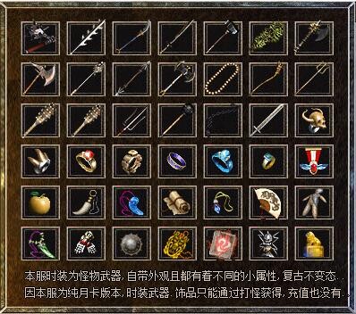 11,新增专属怪物武器约30种不同的外观不同的感觉,散件小装备约20种不变态,每种都有不同的用途,主要增加新的玩法(没有氪金),玩家也有新鲜感!(只能通过打怪获得)